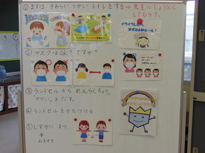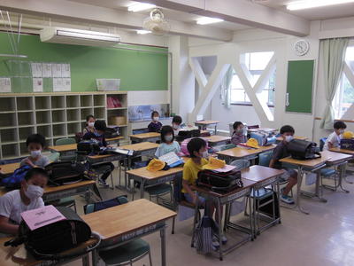 雨の中の登校でしたが、どの通学班も整然と一列に並び、安全に登校することができました。子供たちの登校で、ひっそりとしていた学校に活気が戻り、校舎が生き生きしています。今日は、学校における新しい生活様式について、担任の先生から説明やポイントを聞き、これからの学校生活をイメージしました。今日からまた、勉強や運動を一緒に頑張りましょう!